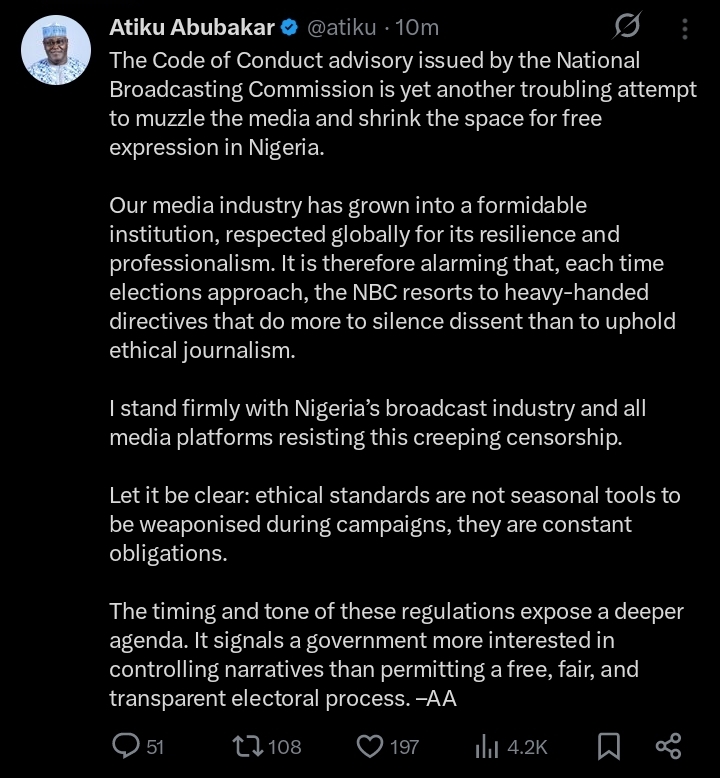 Former Vice President Atiku Abubakar has reacted to a recent notice by the National Broadcasting Commission (NBC) to broadcasters over violations of broadcasting codes during their programmes, saying it is an attempt to stifle press freedom and limit public debate ahead of the 2027 general elections, news.ng reports.