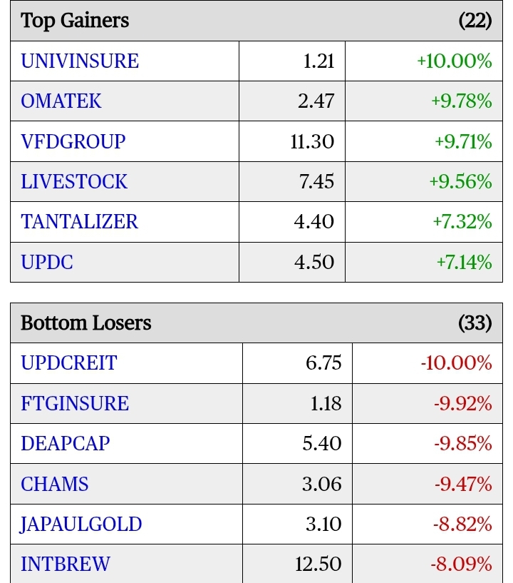 Among the gainers was Universal Insurance Company, whose share price rose by 10% to close at N1.21 per share. Omatek Ventures followed with a 9.78% rise in share price to close at N2.47.