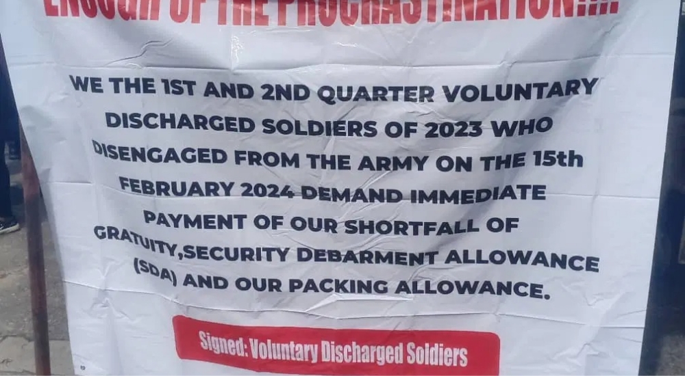 The visibly angry protesters carried placards with messages such as: “We are 1st and 2nd Quarter Retirees of NA 2003. We are living heroes and deserve to be recognized and treated right—not celebrated as fallen heroes when we are no more,”and “We the voluntary discharged soldiers of 2024 demand full payment of our benefits, including shortfalls in gratuity, SDA, parking allowance, and four months’ salary cuts.”