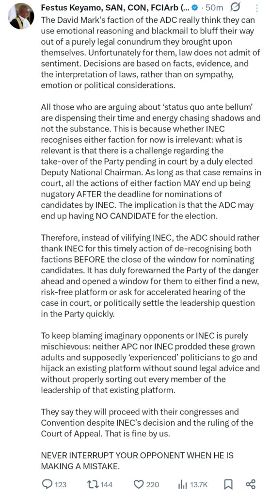 He stated, “The David Mark’s faction of the ADC really thinks they can use emotional reasoning and blackmail to bluff their way out of a purely legal conundrum they brought upon themselves. Unfortunately for them, law does not admit of sentiment.”