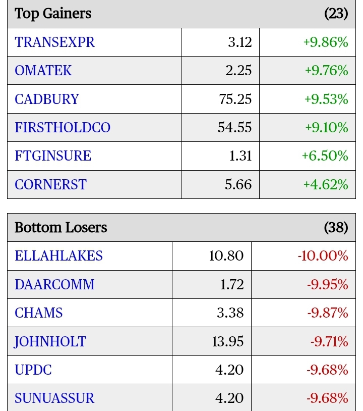 Other gainers include Cadbury Nigeria, which recorded a 9.53% appreciation in its share price to close at N75.25 per share, followed by First HoldCo, which gained 9.1% to close at N54.55 per share.