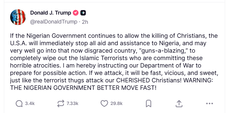 In a Truth Social post on Friday, Trump had declared that “Christianity is facing an existential threat in Nigeria. Thousands of Christians are being killed. Radical Islamists are responsible for this mass slaughter.”